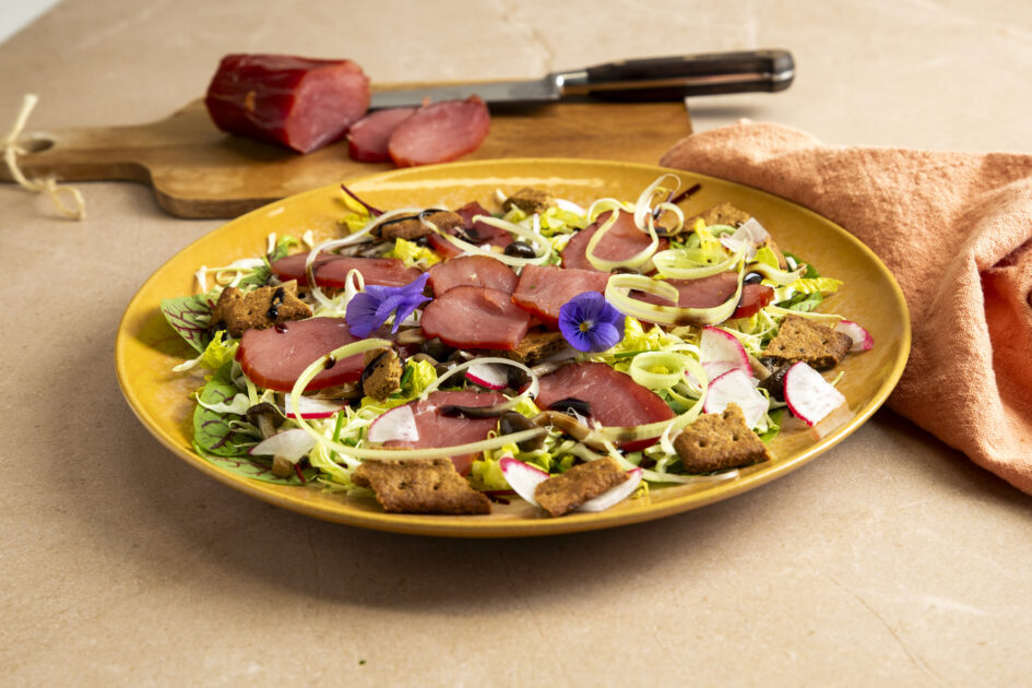 Salat med røget mørbrad og ristede bøgehatte